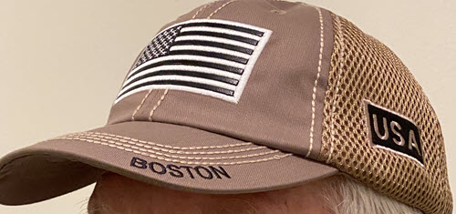 I spotted it in a touristy-kind-of gift shop the other day. The khaki cap offers a nod to Boston on the edge of the brim, with USA displayed on the side. Much more noticeably the front panel sports the American flag in shiny white, charcoal and black. There’s not a hint of red or blue anywhere.